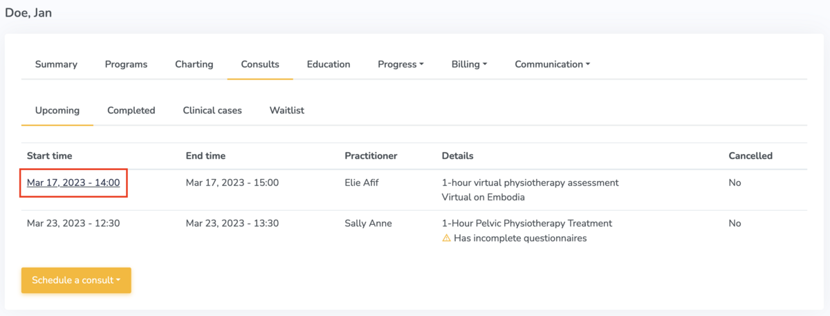 To resend the details of a previously scheduled consult to the patient, visit the consult page by clicking on the Start time of the consult.